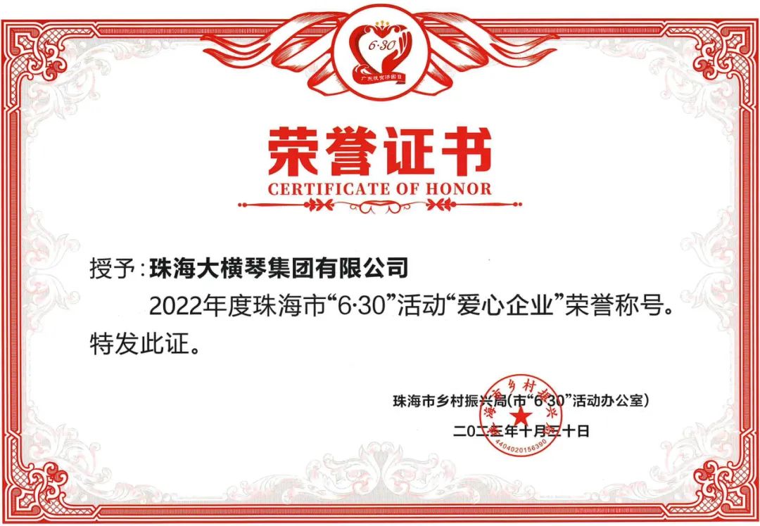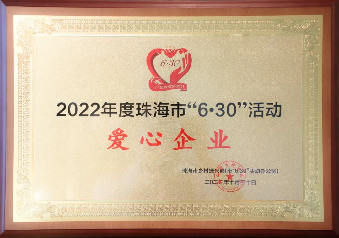 為深入貫徹黨的二十大和中央農(nóng)村工作會(huì)議精神,落實(shí)市委、市政府關(guān)于統(tǒng)籌實(shí)施鄉(xiāng)村振興戰(zhàn)略和“百縣千鎮(zhèn)萬村高質(zhì)量發(fā)展工程”工作部署,匯聚更多社會(huì)力量參與“6·30”活動(dòng),鞏固脫貧成果、助力鄉(xiāng)村振興、促進(jìn)共同富裕,根據(jù)《中共珠海市委農(nóng)村工作領(lǐng)導(dǎo)小組〈關(guān)于印發(fā)珠海市2023年“6·30”助力鄉(xiāng)村振興活動(dòng)工作方案〉的通知》(珠委農(nóng)組〔2023〕6號(hào))精神,市鄉(xiāng)村振興局(市6·30活動(dòng)辦)開展2022年度珠海市“6·30”活動(dòng)“愛心企業(yè)、愛心團(tuán)體、愛心個(gè)人”評(píng)選活動(dòng),向社會(huì)傳遞珠海人民樂善好施的精神品德,激發(fā)社會(huì)各界共襄善舉、助力鄉(xiāng)村振興。經(jīng)評(píng)審,珠海大橫琴集團(tuán)有限公司(以下簡(jiǎn)稱大橫琴集團(tuán))被授予2022年度珠海市“6·30”活動(dòng)“愛心企業(yè)”榮譽(yù)稱號(hào)。