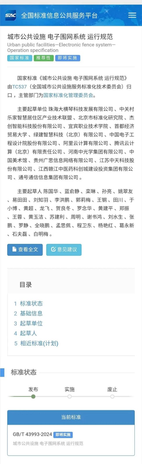 GB/T 43993-2024《城市公共設(shè)施 電子圍網(wǎng)系統(tǒng) 運(yùn)行規(guī)范》于2021年12月立項(xiàng),由大橫琴科技公司主導(dǎo)制定,TC537全國城市設(shè)施服務(wù)標(biāo)準(zhǔn)化技術(shù)委員會提供指導(dǎo)。標(biāo)準(zhǔn)制定工作組經(jīng)過深度場景調(diào)研、密集專題討論、廣泛征求意見、嚴(yán)格技術(shù)審查,歷經(jīng)兩年研制周期,最終確立了電子圍網(wǎng)系統(tǒng)運(yùn)行架構(gòu),明確了運(yùn)行總體原則,并對電子圍網(wǎng)系統(tǒng)的運(yùn)行資源、運(yùn)行服務(wù)、運(yùn)行評價改進(jìn)進(jìn)行了全面規(guī)范化。該標(biāo)準(zhǔn)于2024年4月25日正式發(fā)布,并于2024年11月1日起正式實(shí)施。