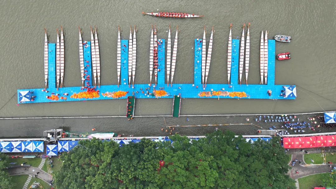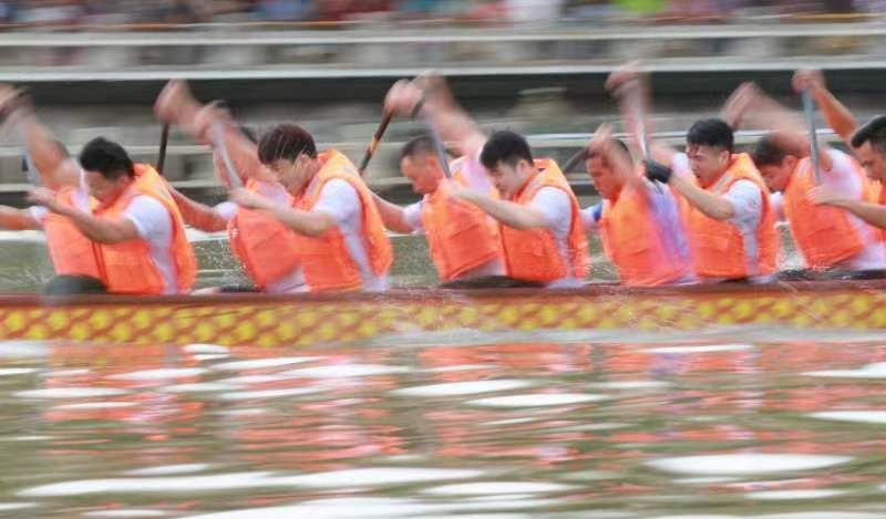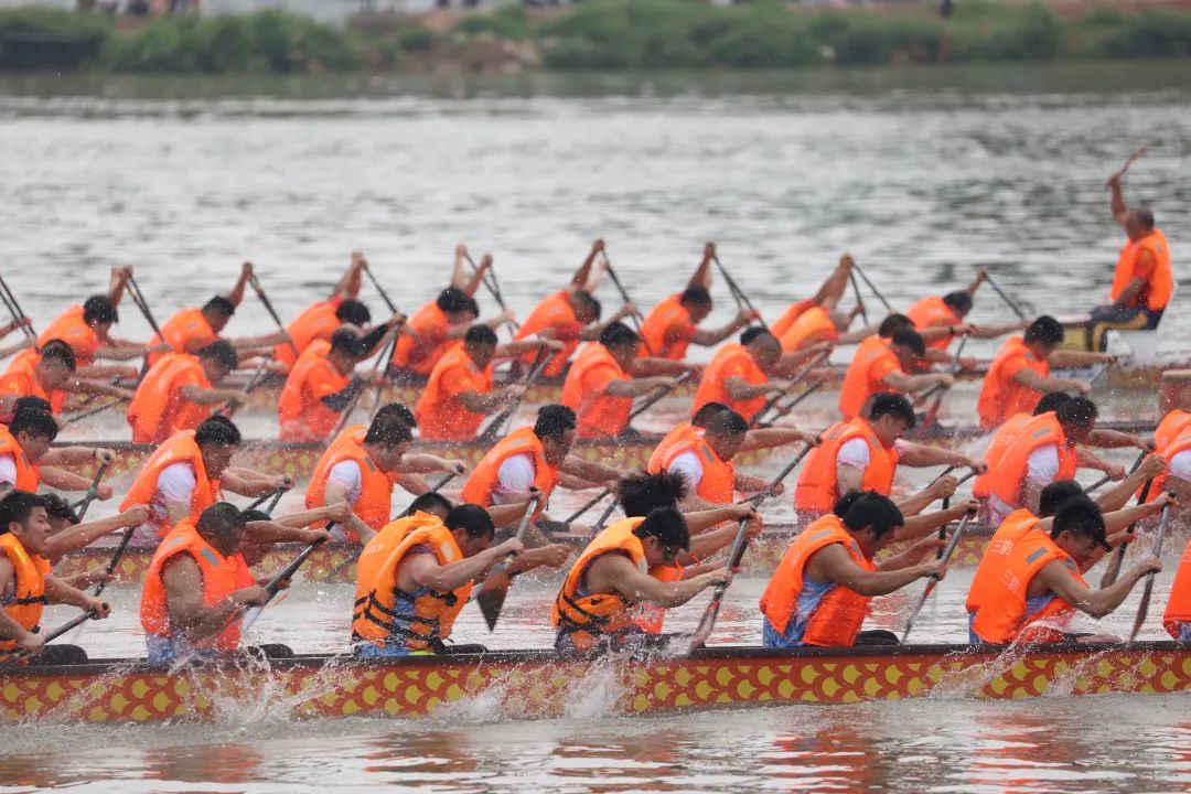 云旗獵獵,鑼鼓頻催。賽場上,在富有節(jié)奏的鼓聲下,整齊劃一的動作,奮力揮槳、劈波斬浪,河面上演著“速度與激情”。