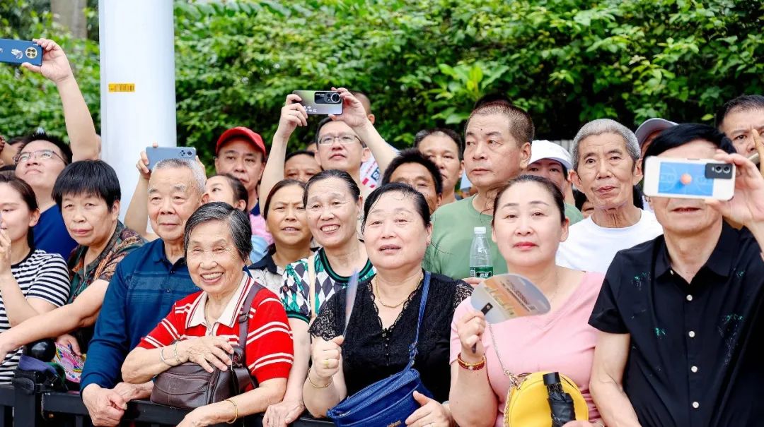 “我每年都和爸爸媽媽一起來看龍舟賽,現場的氛圍太震撼了!作為斗門人,我感到非常開心和自豪?!倍烽T小觀眾彥宏開心地說。與此同時,不少游客專門從外地趕來觀賞這場“水上競技盛宴”。在眾多觀眾中,來自南屏的歐先生是龍舟賽的“鐵桿粉絲”,盡管的腿部受傷,他也要雙手拄著拐杖,全程站著關注觀賽。