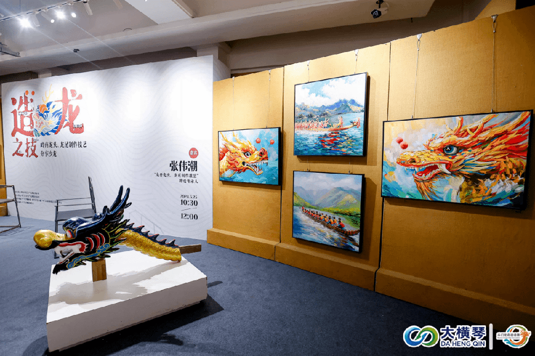 斗門龍舟賽深厚底蘊,不僅僅是一場水上競渡,更是一系列民俗文化的集大成者。睇龍船、嘆非遺,與比賽同步進行的,還有“龍騰黃楊——珠海龍舟民俗文化藝術展”和傳承人張偉潮分享的“端午龍舟龍頭龍尾制作技藝”沙龍。