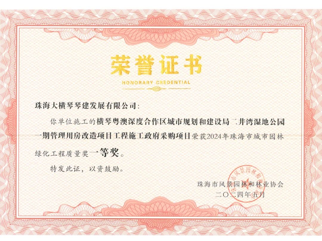 橫琴粵澳深度合作區(qū)城市規(guī)劃和建設(shè)局市政管理署2023年專類公園綜合管養(yǎng)政府采購項目、橫琴粵澳深度合作區(qū)城市規(guī)劃和建設(shè)局二井灣濕地公園一期管理用房改造項目工程施工政府采購項目,榮獲2024年珠海市城市園林綠化工程質(zhì)量獎一等獎!富山工業(yè)城B區(qū)展示區(qū)園林景觀提升工程,榮獲2024年珠海市城市園林綠化工程質(zhì)量獎二等獎!