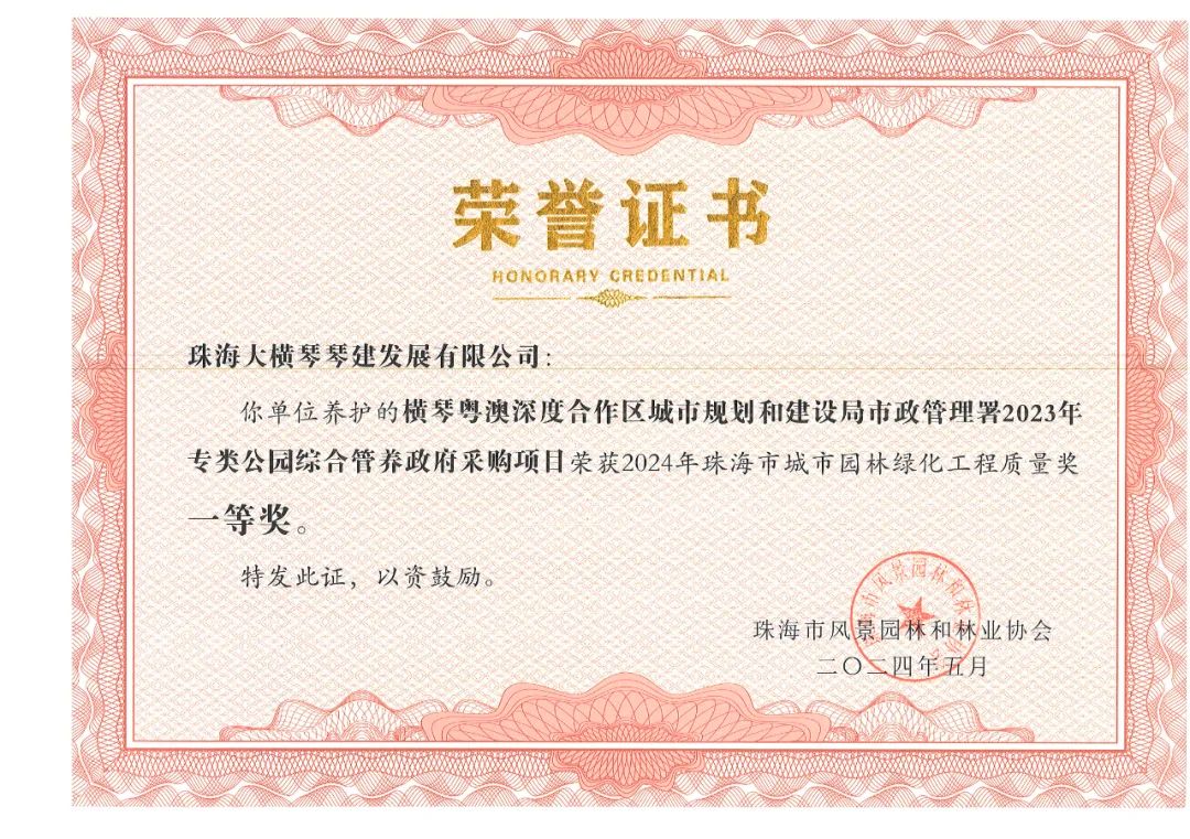 珠海市城市園林綠化工程質(zhì)量獎是本市園林綠化工程類的重要獎項,旨在提高景觀園林綠化建設(shè)的質(zhì)量和水平,評選出在全市具有引導(dǎo)和示范作用的景觀園林綠化優(yōu)秀工程及養(yǎng)護項目。本次獲獎,是珠海市風(fēng)景園林和林業(yè)協(xié)會對大橫琴集團管養(yǎng)項目、施工項目與代建項目品質(zhì)的認可與鼓勵。同時也是大橫琴集團在貫徹落實市委、市政府關(guān)于“綠美珠海生態(tài)建設(shè)”工作部署中取得的階段性成效。