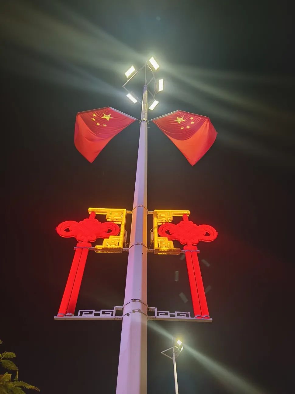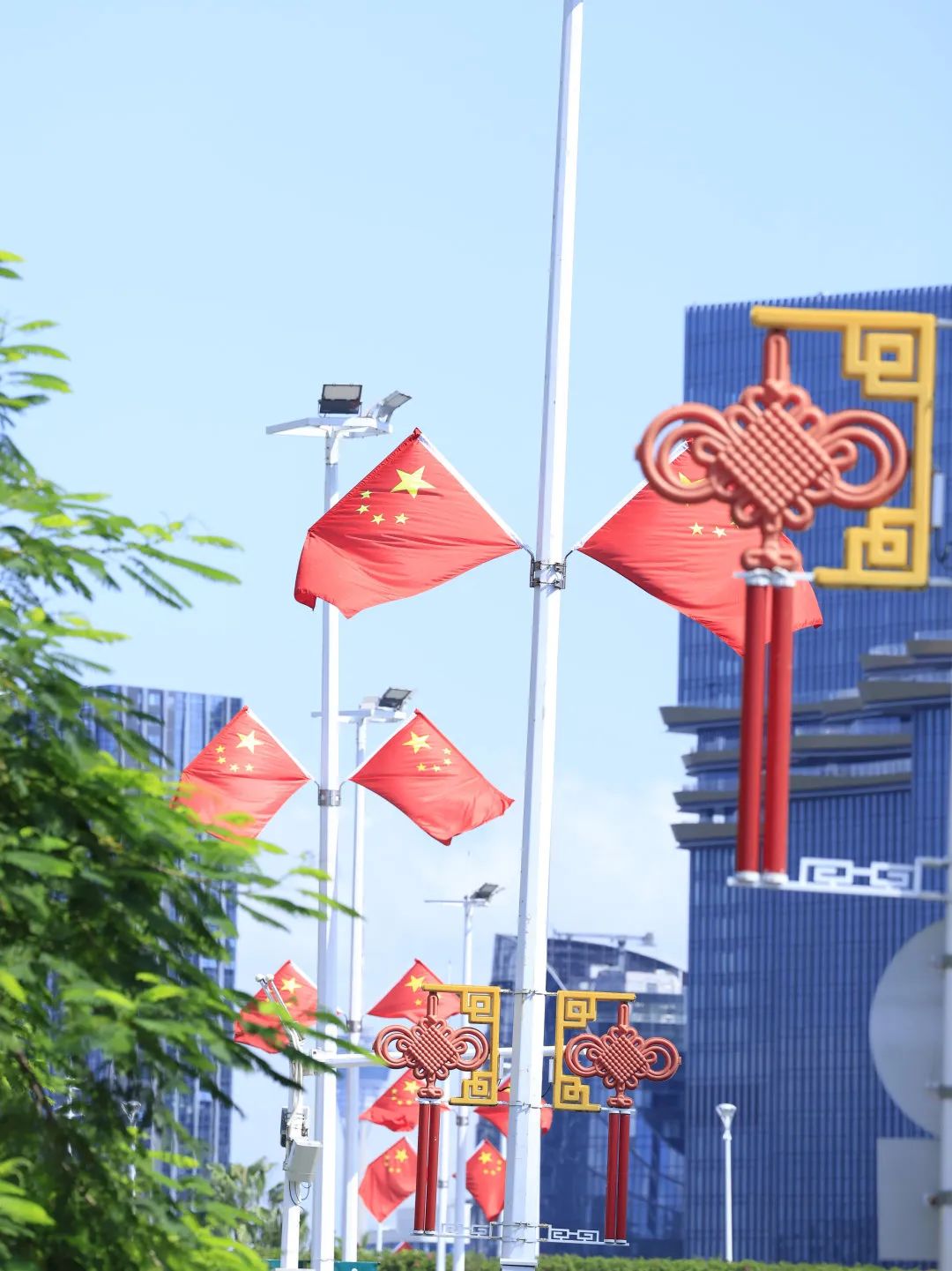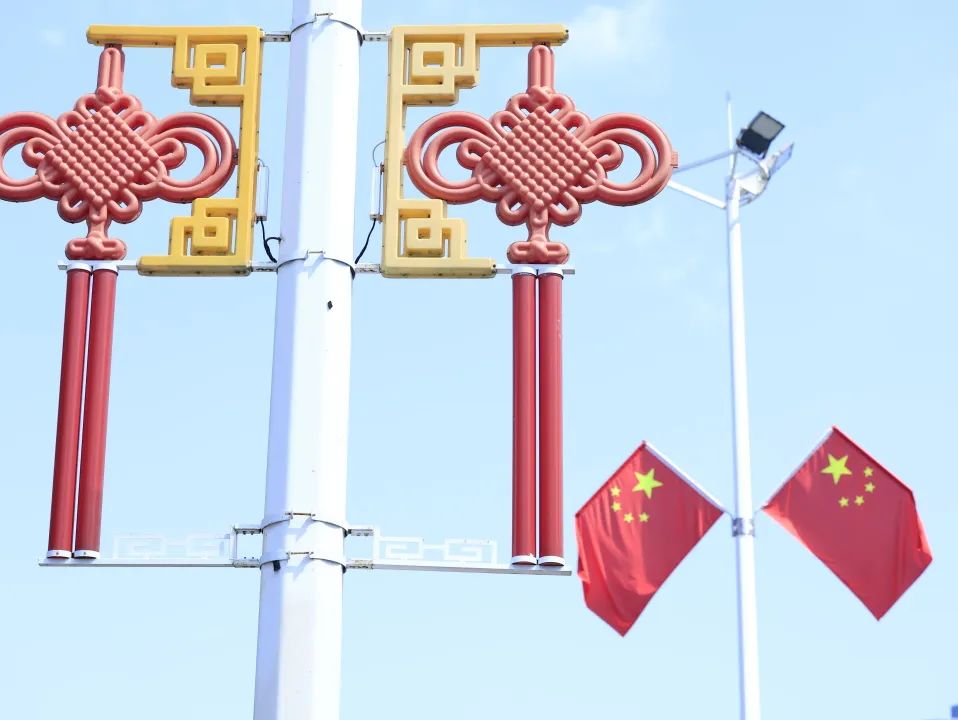 喜慶的中國(guó)結(jié)與迎風(fēng)飄揚(yáng)的五星紅旗交相輝映
