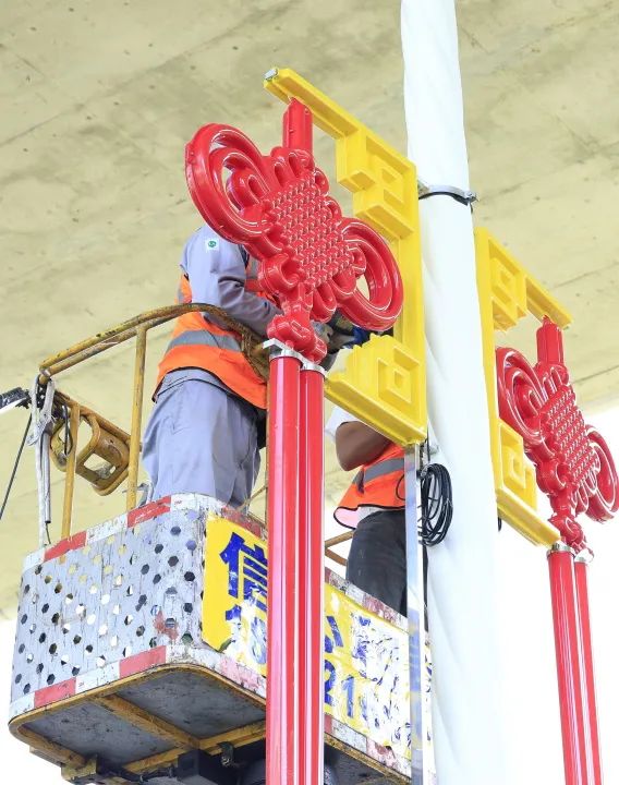 作業(yè)人員在各主干道懸掛中國(guó)結(jié)