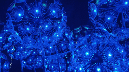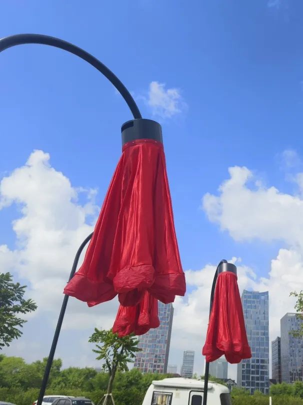 橫琴生態(tài)澤園的創(chuàng)意燈飾以含苞待放的喇叭花為主體造型,花朵使用充氣物料制成,內(nèi)部藏有感應(yīng)器。