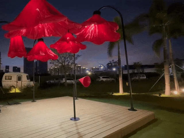 夜晚,當(dāng)游人經(jīng)過(guò),在喇叭裝置處說(shuō)出“熱烈慶祝中華人民共和國(guó)成立75周年”、“熱烈慶祝澳門(mén)回歸祖國(guó)25周年”等祝福語(yǔ)時(shí),花朵會(huì)自動(dòng)打開(kāi)并亮燈,創(chuàng)造出驚喜的互動(dòng)體驗(yàn)。