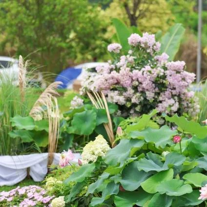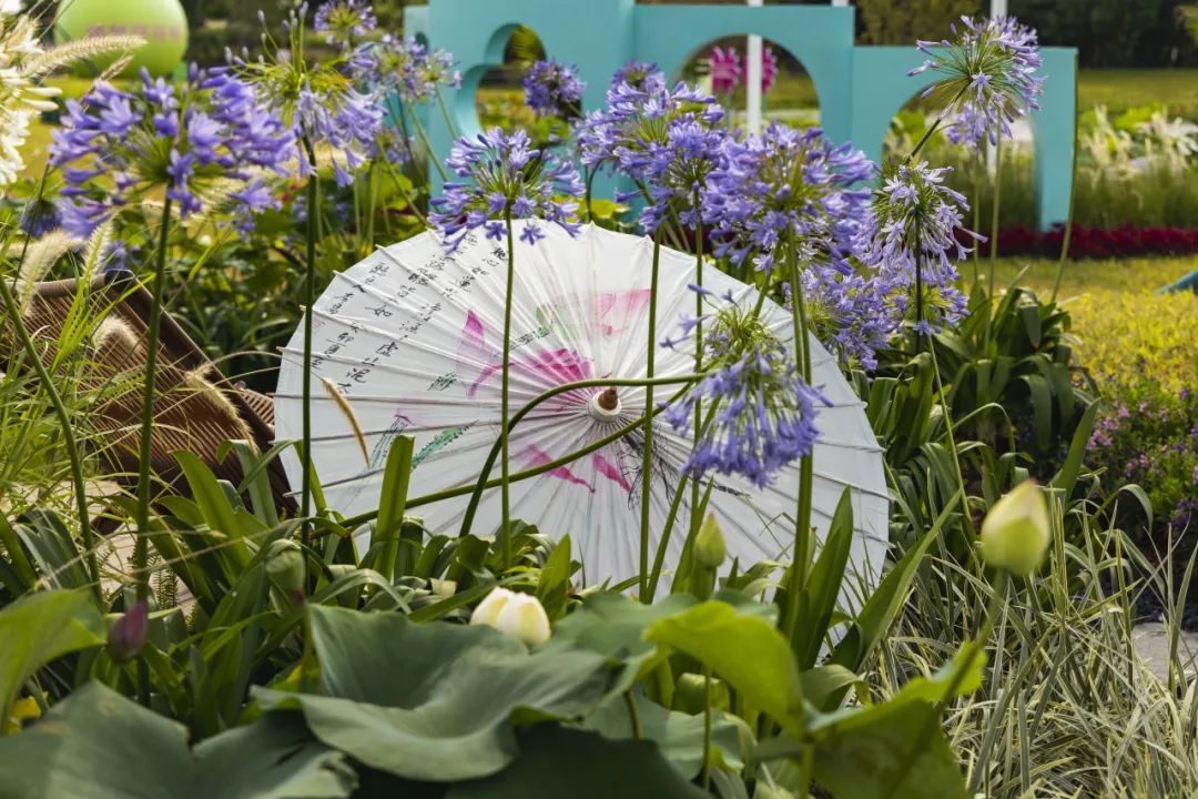 展園整體以典雅氛圍為基調(diào),白荷花與藍紫色的百子蓮則為點睛之筆,形成視覺焦點,現(xiàn)代素材與傳統(tǒng)意境相互碰撞,打造清新與浪漫的場景。