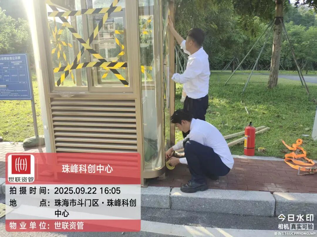 對門窗加裝木方、貼米字膠帶加固,檢查辦公設(shè)備,關(guān)閉非必要用電設(shè)備,并對辦公區(qū)域的安全用電、消防安全、辦公設(shè)備防護(hù)、應(yīng)急管理措施等進(jìn)行全方位排查與整治。